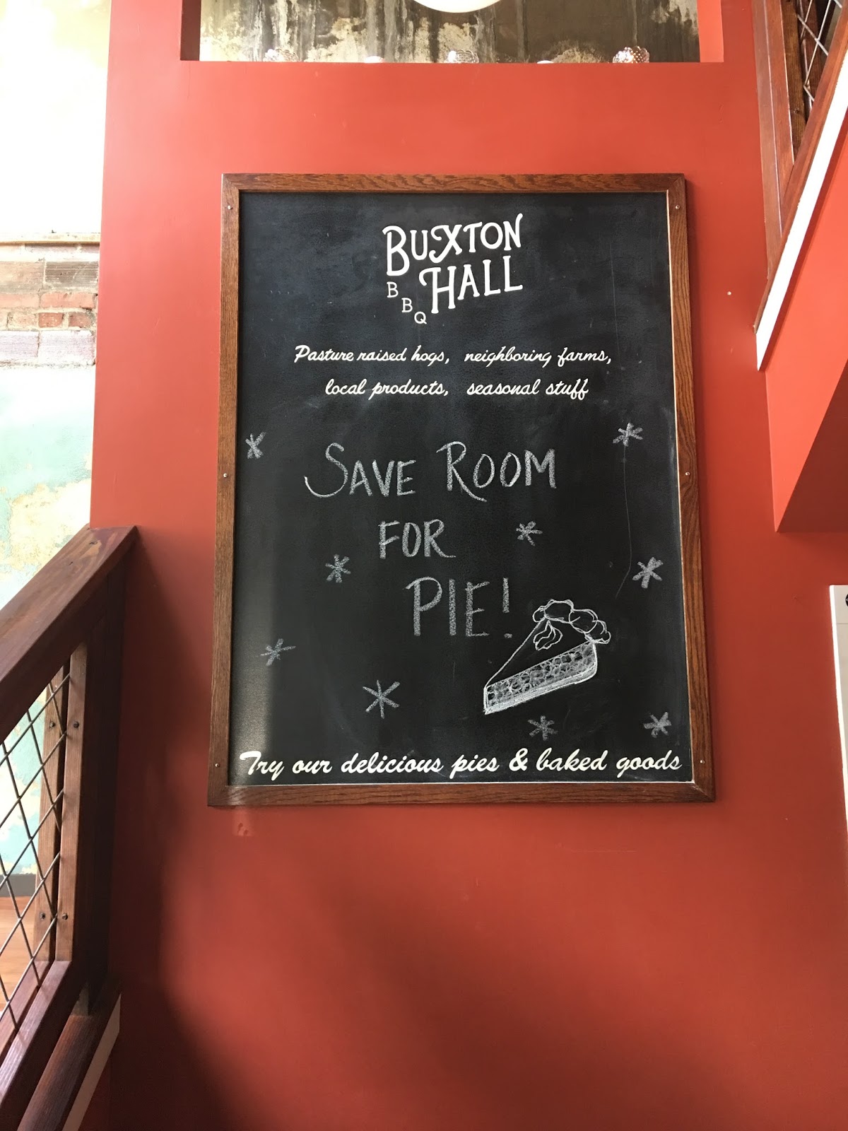 Buxton Hall is known for their Eastern NC style BBQ where they smoke their hogs low and slow for 18 hours over hardwood coals infused with vinegar mop, the owner's family recipe. I went for the pulled pork plate while Jeremy got the special, a rack of ribs. We both licked our plates clean and I went home with some pie for dessert. Hey, I just followed directions from the sign that said to leave room for pie.